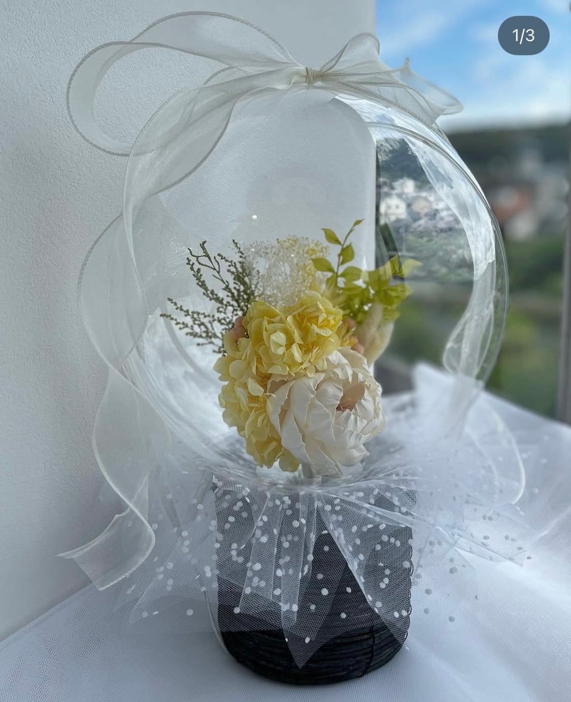 アクアバルーンフラワードライフラワーとプリザーブドフラワーをブーケにしバルーンで包み込んでおります。