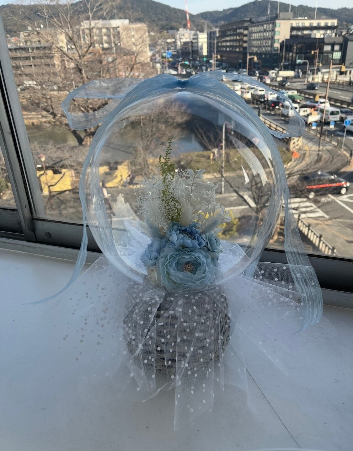 アクアバルーンフラワードライフラワーとプリザーブドフラワーをブーケにしバルーンで包み込んでおります。